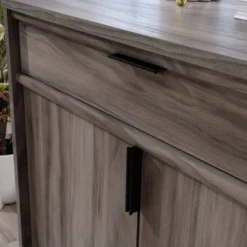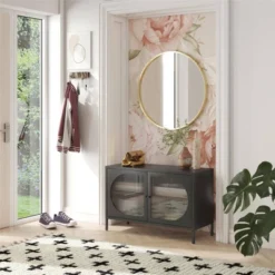 Provide your entry with function and Mid-century style with the Ana Entryway Cabinet. Versatility best describes this very useful cabinet constructed of MDF veneer oak finish, tapered rubberwood legs, and accented with antique brass handles. Three drawers in multiple sizes with a spacious lower cabinets provides ample storage for all of your various needs.