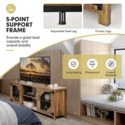 - High-Strength Construction: The entire structure is made of thickened MDF which is very smooth and waterproof for easy cleaning. Apart from four MDF legs, the TV console cabinet has a fifth support leg made of rustproof sprayed steel fitted with an adjustable foot pad for better load capacity of 245 lbs.