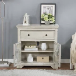 This buffet showcases a mix of materials for just the right amount of coastal farmhouse flair in your dining room. The smooth straight lines of the body frame the basket weave patterns of the four door fronts on our credenza. Finished in our Jasper two tone and enhanced by the simplicity of the dark open metal framing of the base. With touch latch hardware, a spacious shelved interior and a large surface area for display, this beautiful credenza is sure to be a favorite for years to come.